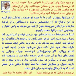در مورد شرکتهای تجهیزاتی با نامهایی سبک طرف نیستیم که بی محابا چوب حراج سنگین بچرخانیم پای ایران ممکو، فجر شاهد، عالی پیام، مارستان، باهرمهد و ۲۴ شرکت دیگر در میان است، احتیاط کنید و افراط نکنید.